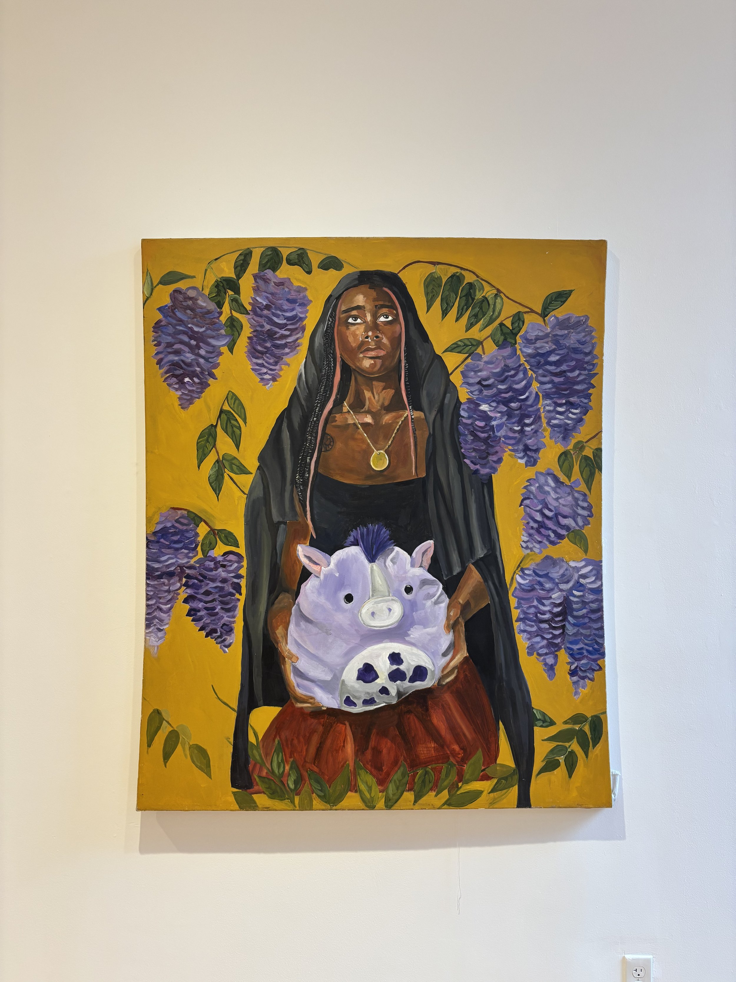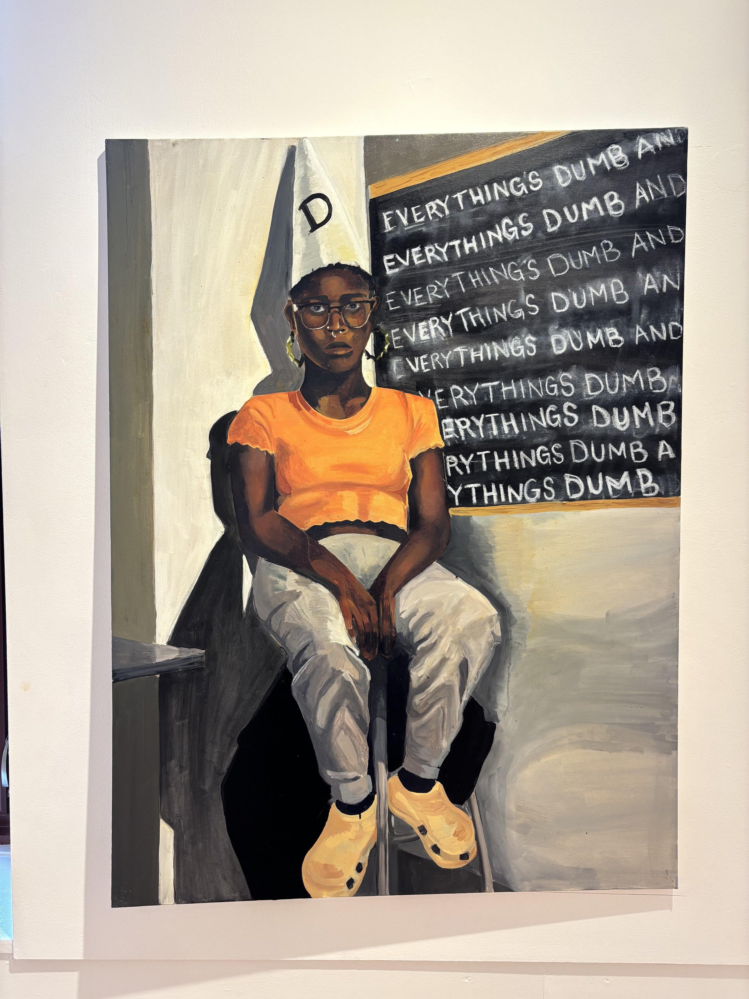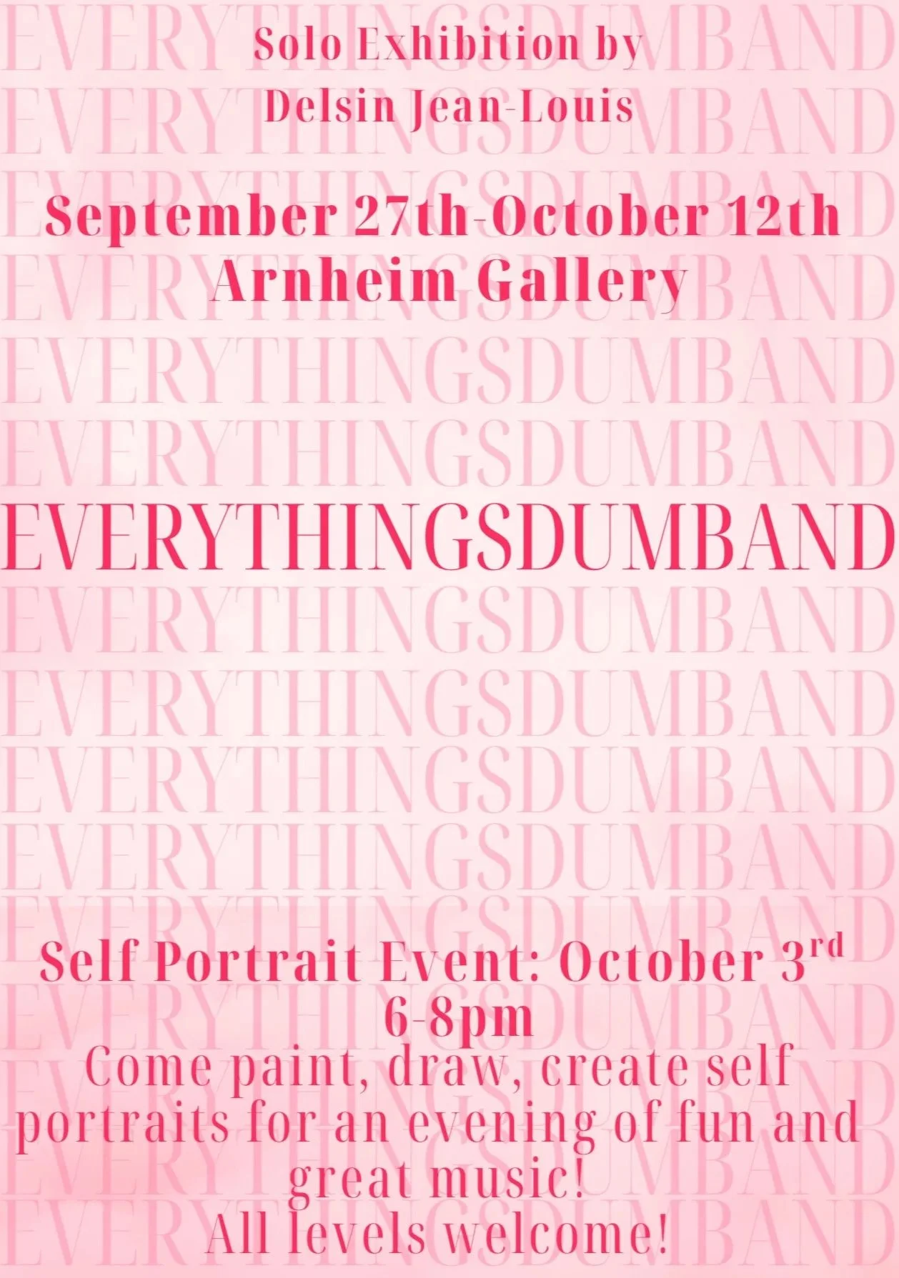 The solo exhibition EVERYTHINGSDUMBAND is named after my most consequential work, that I created during my senior year of undergrad at MassArt. This work is a commentary of my own intrusive thoughts. These self portraits are commentaries on other aspects of my personal life, such as mental health struggles, over-sexualization and being a targeted member of society as a black queer woman. Creating self portraits as a black, queer woman is inherently political. Black women in society are ostracized, over sexualized and their femininity is stripped from them. It is important for me to create work that I believe to be beautiful, feminine, ornate allowing other black women to see themselves in the art world and in my work.