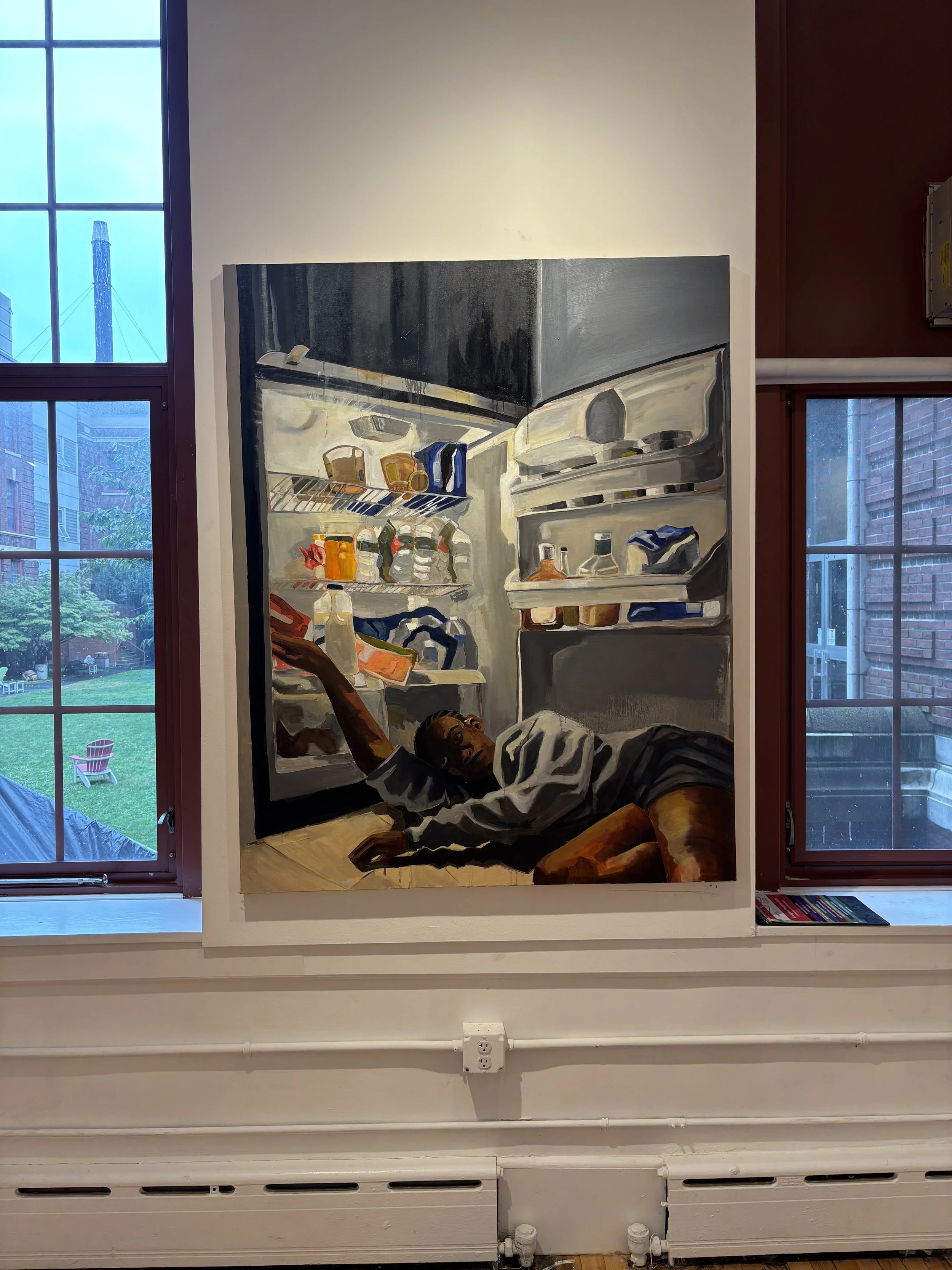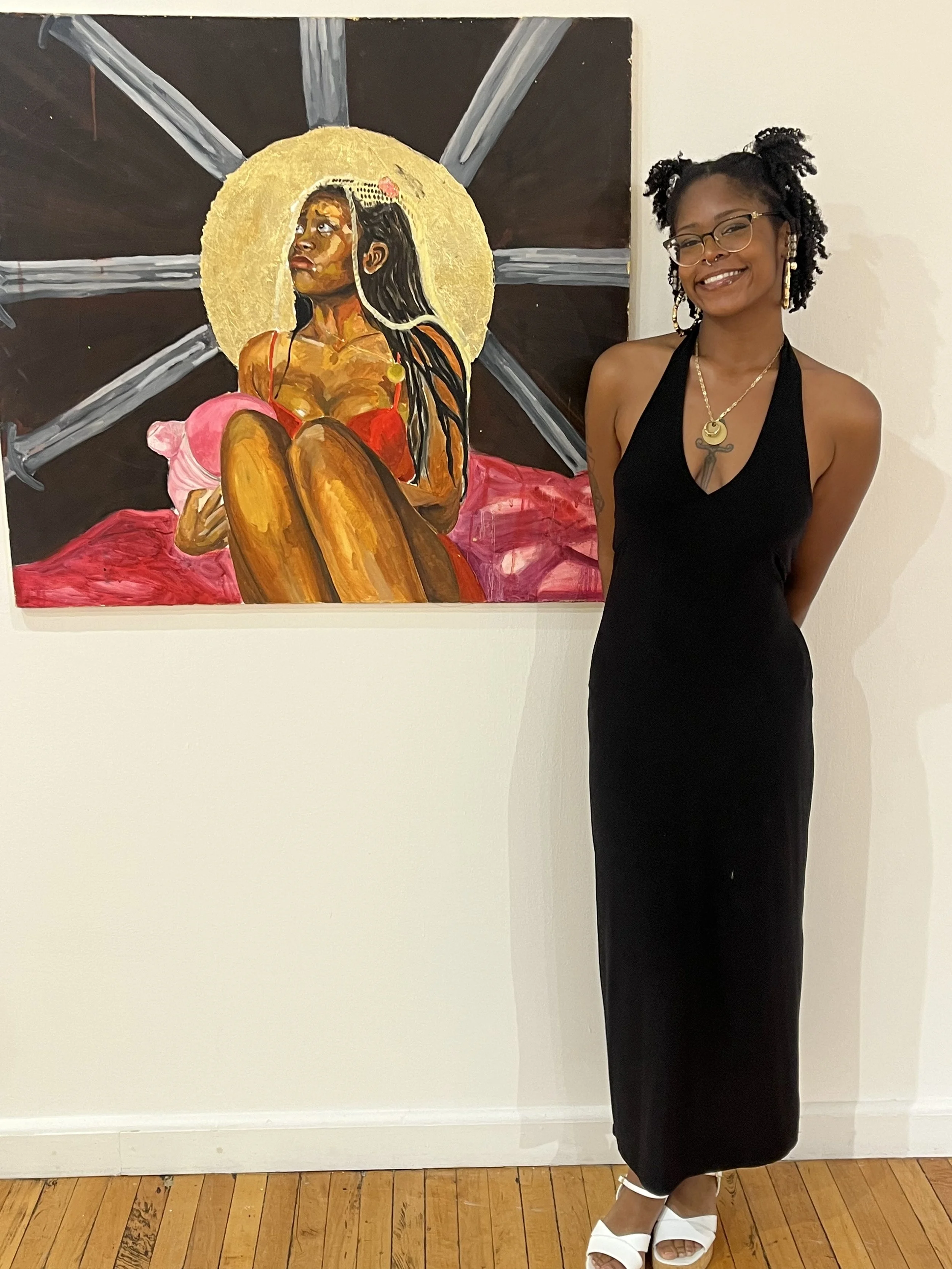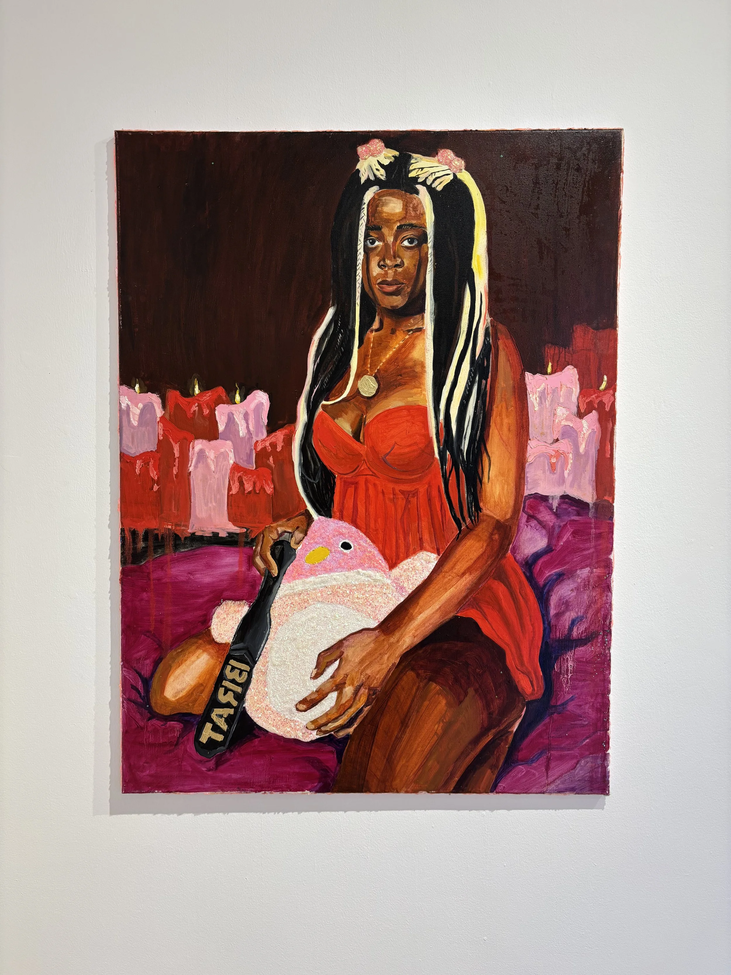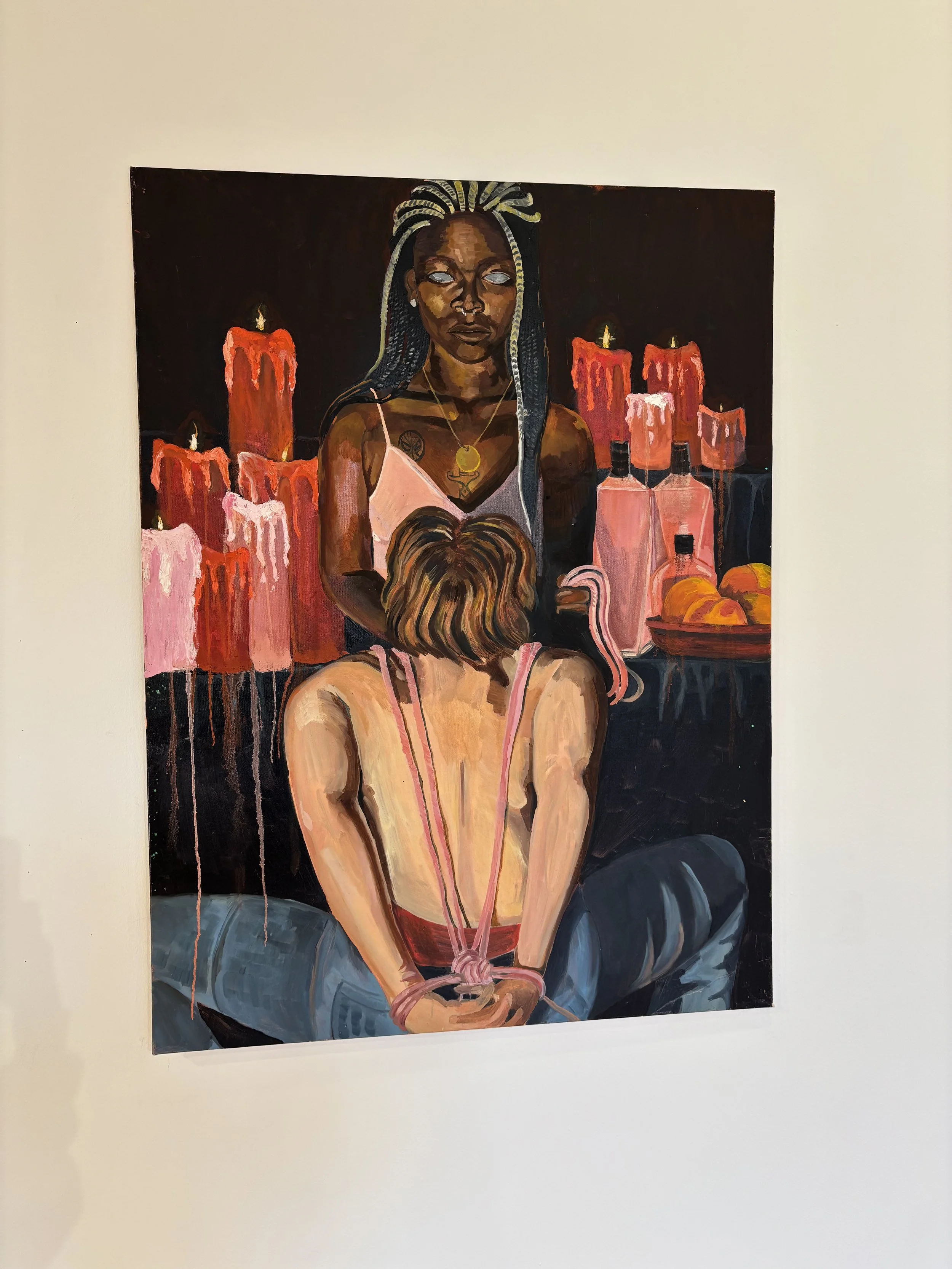 The solo exhibition EVERYTHINGSDUMBAND is named after my most consequential work, that I created during my senior year of undergrad at MassArt. This work is a commentary of my own intrusive thoughts. These self portraits are commentaries on other aspects of my personal life, such as mental health struggles, over-sexualization and being a targeted member of society as a black queer woman. Creating self portraits as a black, queer woman is inherently political. Black women in society are ostracized, over sexualized and their femininity is stripped from them. It is important for me to create work that I believe to be beautiful, feminine, ornate allowing other black women to see themselves in the art world and in my work.